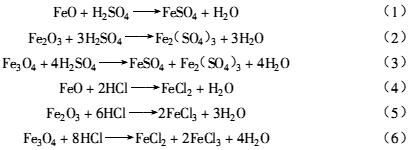 a.鋼鐵的除銹 鋼鐵表面的銹蝕主要成分是Fe2O3及Fe3O4和FeO,熱處理后的氧化皮主要是Fe3O4。這些鐵的氧化物都可用硫酸、鹽酸或混合酸處理除掉,其化學反應如下: