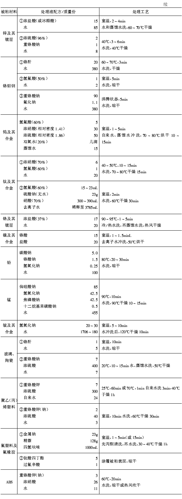化學處理用的氫氟酸是劇毒物質,鉻酸及鉻酸鹽毒性也很大,硫酸、硝酸、氫氧化鈉等都有強腐蝕性,使用時一定要特別當心,注意安全,通風良好,防止中毒,避免傷害,減少泄漏,保護環境。化學處理后的廢液及沖洗用水應進行必要的處理,不可隨意排放造成環境污染。由于六價鉻的高毒性和致癌性,近年來,德國漢高公司開發了鋼鐵、鋁合金的表面處理無鉻化技術。表7-12列舉了各種材料化學處理方法。金屬粘接前的處理可參考ASTMD2651-01標準,結構粘接的鋁表面磷酸陽極化處理方法參見ASTMD 3933-98標準,塑料粘接前表面處理方法可參考ASTMD 2093-97標準。國內已開發成功一種金屬粘接前KJ型表面處理劑,主要成分為環己六醇六磷酸酯,能與金屬反應生成絡合物,在金屬表面形成一層致密單分子保護膜,阻止氧氣和濕氣對金屬的腐蝕,且與環氧膠結合力強。實踐證明,完全可以替代傳統的磷化工藝,高效、無毒、環保。