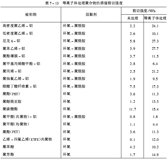 (5)等離子體處理等離子體是一種由離子、電子和中性粒子組成的部分或全部反應活性很大的離子化氣體。等離子化學反應的主要特征是只在固體材料表面薄層發生反應,而材料內部基本不受影響,處理時間(幾秒到幾分鐘)很短。因此,將這一特性用于高分子材料的表面改性,具有重要的實際意義。尤其是低表面能材料如聚烯烴、聚四氟乙烯、聚對苯二甲酸乙二醇酯、尼龍、硅橡膠等,可使粘接強度提高十到幾百倍。經過等離子處理的聚醚醚酮用環氧膠黏劑粘接的強度很高。聚乙(丙)烯在氧等離子體中處理10min后,用環氧膠黏劑粘接的剪切強度大于20MPa。